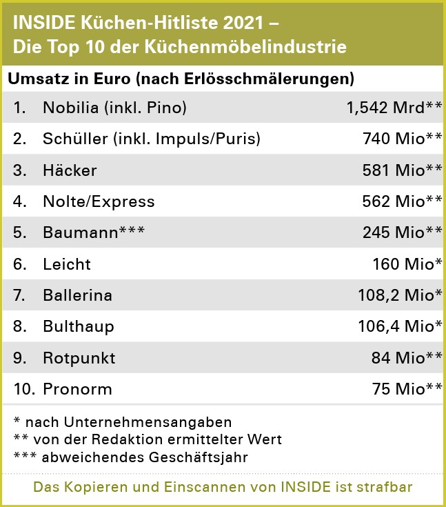 Mit 8,2 Prozent Plus brachte es Nobilia 2021, in dem Jahr, in dem die neuen Werke in Saarlouis und Am Hüttenbrink in Betrieb genommen wurden, auf einen neuen Umsatzrekord von 1,482 (Vorjahr laut Bundesanzeiger: 1,370) Mrd Euro. Das entsprach einer Steigerung um 8,2 Prozent. Während der Inlandsumsatz aufgrund der Lockdowns im Handel um 2 Prozent auf 695,5 Mio Euro sank, explodierte der Auslandsumsatz nahezu um 19,4 Prozent auf 787 Mio Euro. Der Exportanteil erreichte 53,1 Prozent. 830.000 Küchenkommissionen oder 8,3 Mio Schränke und 1,75 Mio Arbeitsplatten hat Nobilia in Summe produziert und 2,8 Prozent mehr E-Geräte verkauft als im Vorjahr. Hinter diesen Zahlen verbirgt sich reiner Industrieumsatz. Unter Berücksichtigung von Nobili-as Handelsaktivitäten im Ausland (konsolidiert und quoten-bereinigt) stieg der Gruppenumsatz sogar um 11,2 Prozent auf 1,715 Mrd Euro. Von den Franchiseorganisationen im Ausland fließen übrigens nur die Franchisegebühren in die Berechnung ein. Seit wenigen Jahren beziehen wir in die INSIDE Küchen-Hitliste auch die Umsätze der Nobilia-Beteiligung Pino in Coswig mit ein, die in der Tabelle noch auf die 1,482 Mrd Euro draufgerechnet werden – nach Erlösschmälerungen trägt Pino geschätzt 60 Mio Euro bei. Macht in Summe 1,542 Mrd Euro.