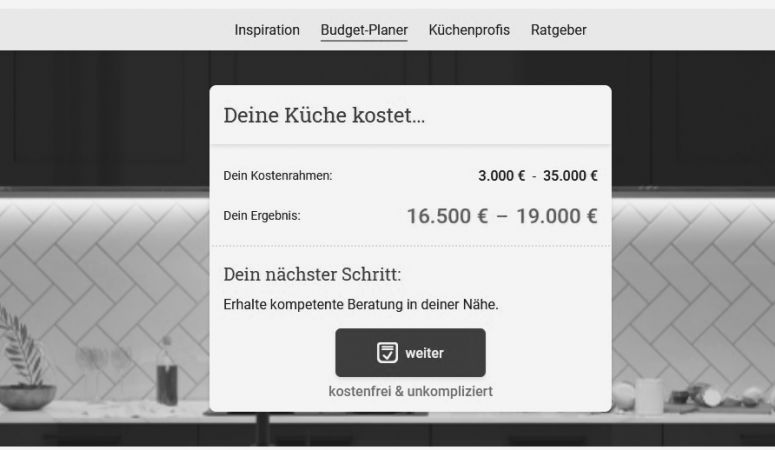 Dementsprechend war das Thema Küche bei moebel.de bislang zu einem großen Teil außen vor. Lediglich einfache Produkte wie Küchenzeilen oder Buffets waren gelistet. Geplante Einbauküchen waren es nicht. Und sind es auch nach wie vor nicht. Stattdessen findet man auf der Seite moebel.de nun einen Bereich Küche, in dem sich Endverbraucher aus rund 800 Produktbeispielen Inspirationen holen und in Ratgeberbeiträgen schmökern können, gezielt nach Händlern suchen oder auch einen Budgetplaner durchlaufen, vergleichbar mit einem Auto- Konfigurator.