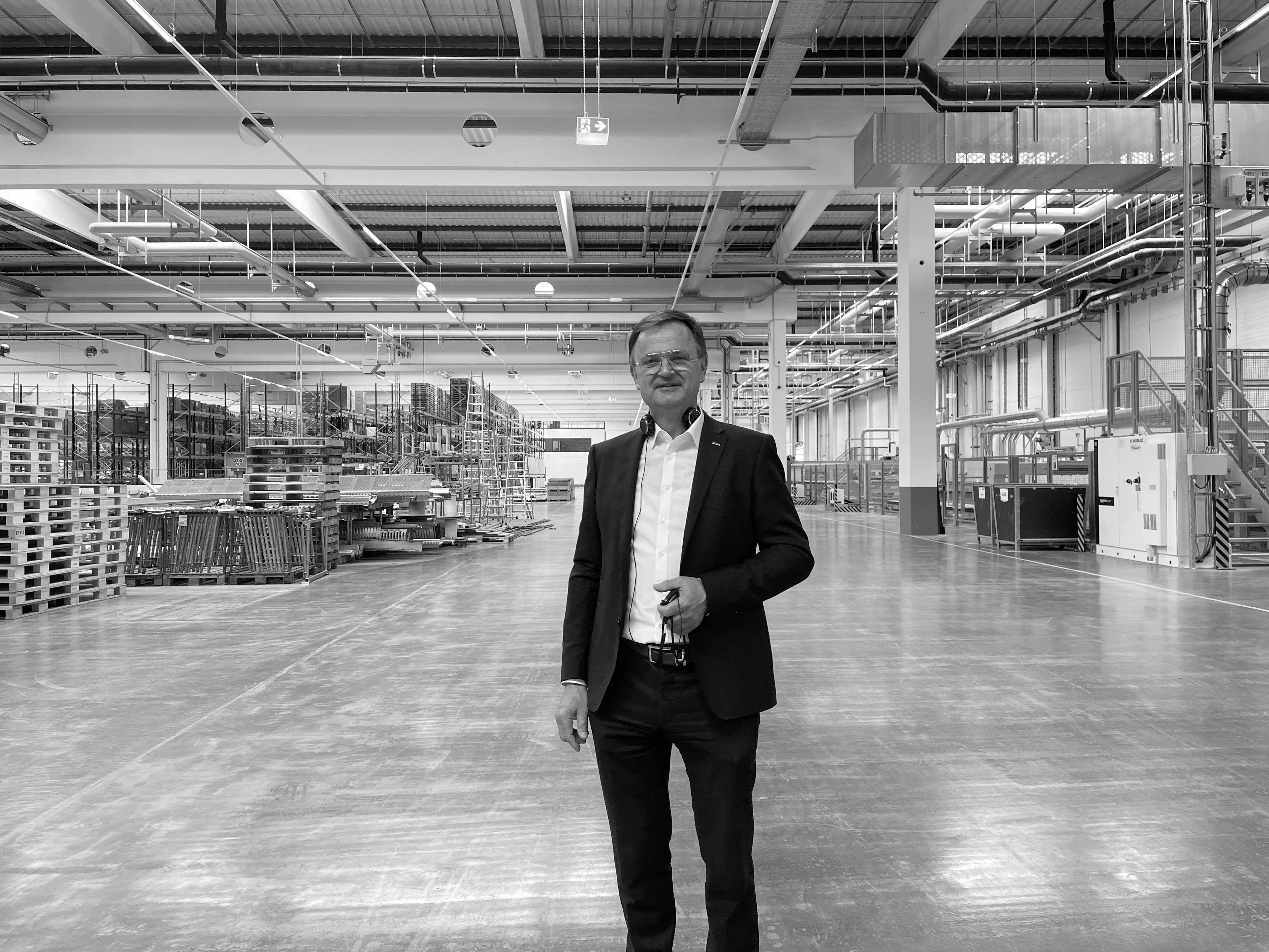 Die neue Fertigung 2 hat beeindruckende Ausmaße, in der Fläche, aber auch in der Höhe. „Wir könnten hier auch eine zweite Ebene einziehen, so ist das angelegt“, sagt Schüller-Geschäftsführer Max Heller beim Rundgang. Derzeit werden quasi nur im Erdgeschoss der neuen Halle Küchen gebaut. Und die Zeiten sind grad ja nicht so, dass man für die nächsten 12 Monate mit Boom rechnet. Könnte also noch dauern, bis ein weiteres Stockwerk eingezogen wird. Per Ende Mai lag Schüller mit 9 Prozent im Plus, bei Lieferzeiten etwas über dem Marktdurchschnitt.